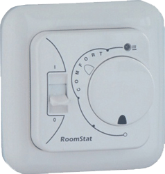 Классический вариант комнатного терморегулятора с выносным датчиком температуры пола и разнесенными органами управления - включения/выключения прибора и регулировки установленной температуры. Встроенный монтаж. Терморегулятор RoomStat 110 предназначен для постоянного поддержания установленной температуры. Удобная ручка установки температуры, светодиодный индикатор включенного состояния, наглядная графическая информация, клавиша вкл.выкл.