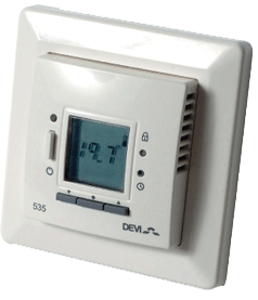 Электронный терморегулятор применяют для систем комфортного подогрева поверхности или для систем полного отопления помещений. Прибот оснащен встроенным датчиком температуры воздуха и датчиком температуры пола на проводе. Имеет таймер. Конструкция корпуса предполагает установку на стену в монтажную коробку. Двуполярный выключатель питания.