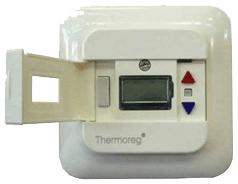 Nexans OTN2OTN2 – простой в использовании терморегулятор. Цифровой дисплей позволяет удобно устанавливать необходимую температуру. Включение и выключение терморегулятора происходит с помощью белой кнопки-выключателя. Красная кнопка используется для повышения температуры, синяя - для понижения. Между красной и синей кнопками находится кнопка программирования температур. Красный индикатор светодиода показывает, что обогрев включен.